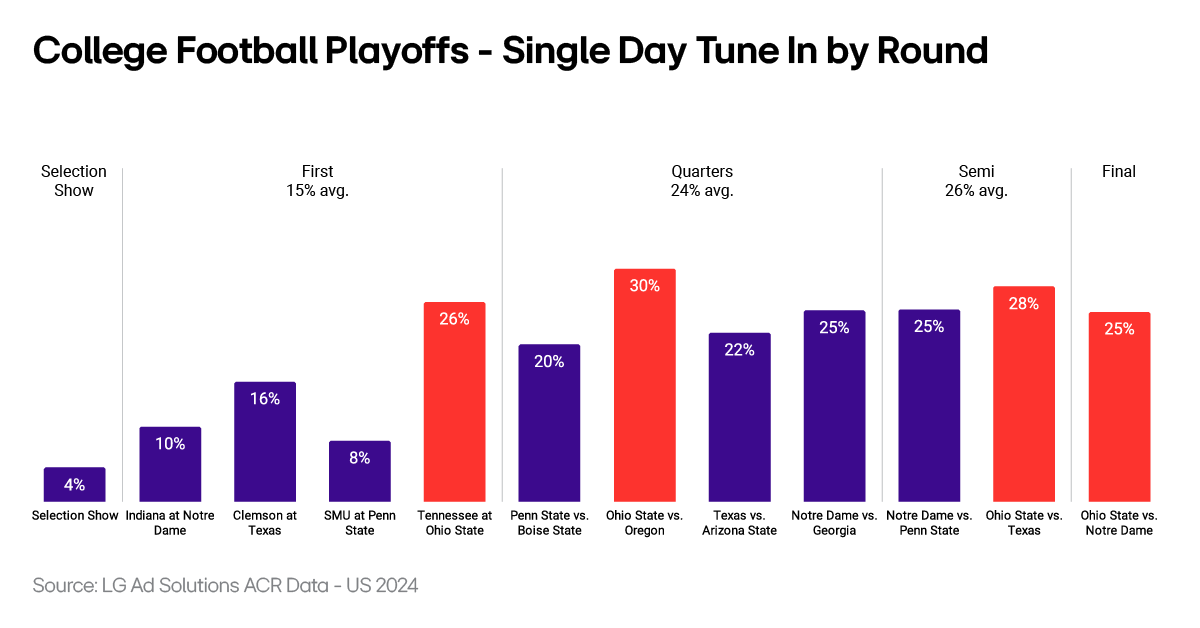 The shift from a 4-team to a 12-team College Football Playoff format during the 2024 season not only impacted college football programs (both finalists likely wouldn’t have made the cut under the older system) but also had major implications for advertisers looking to surround the event. More specifically, the number of playoff games jumped from 3 to 11, the total time the playoffs lasted for more than doubled (20 days vs. a previous 8), and the selection show became higher stakes with fans wondering which teams made it and which teams missed the cut. Given LG Ad Solutions’ ability to see what hits the glass via our Automatic Content Recognition technology, we wanted to share some lessons learned from the 2024 Playoffs so advertisers can update their Sports advertising playbook.