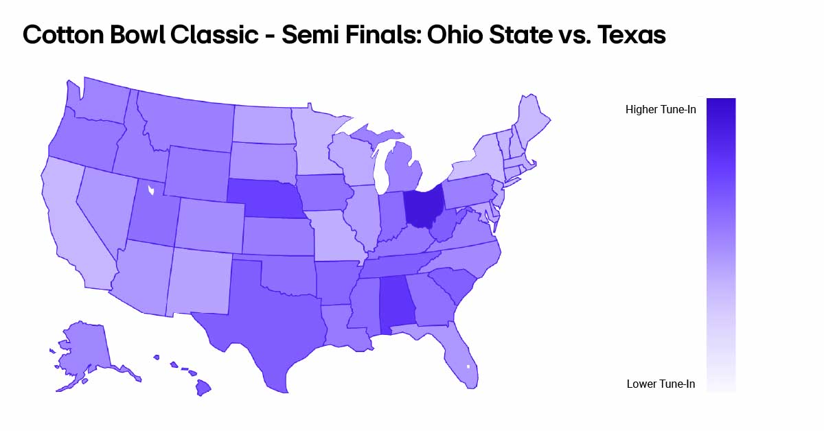 Although not unique to the 12 round playoff format, one of college football’s biggest pulls is the regional fandom. In the above tune-in by state chart, it is easy to see how the state of Ohio was committed to watching the game. In fact, more than half of all LG Households in Ohio tuned-in to the Cotton Bowl Semi Finals! And while Texas as a state had above average tune-in, the map reveals states that have interest in college football like Nebraska and Alabama (a traditional college football powerhouse who didn’t make the playoffs in 2024).